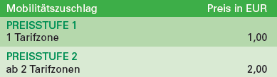 - Der Preis für eine Fahrt setzt sich pro Person aus einem Grundfahrpreis gemäß VMS-Tarif und einem Mobilitätszuschlag entsprechend der Anzahl der befahrenen Tarifzonen zusammen. Der Mobilitätszuschlag gilt jeweils fahrtbezogen und ist im jeweiligen Fahrzeug je nutzungsberechtigte Person zu entrichten (kein Vorverkauf).